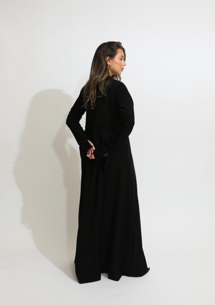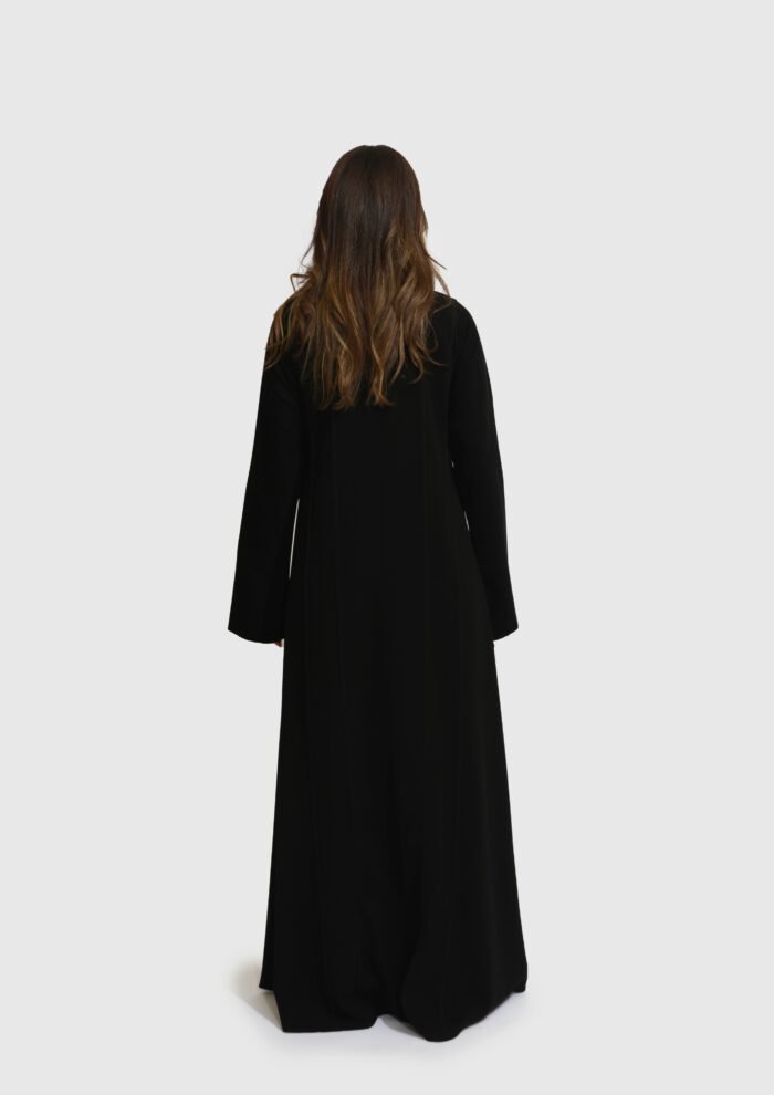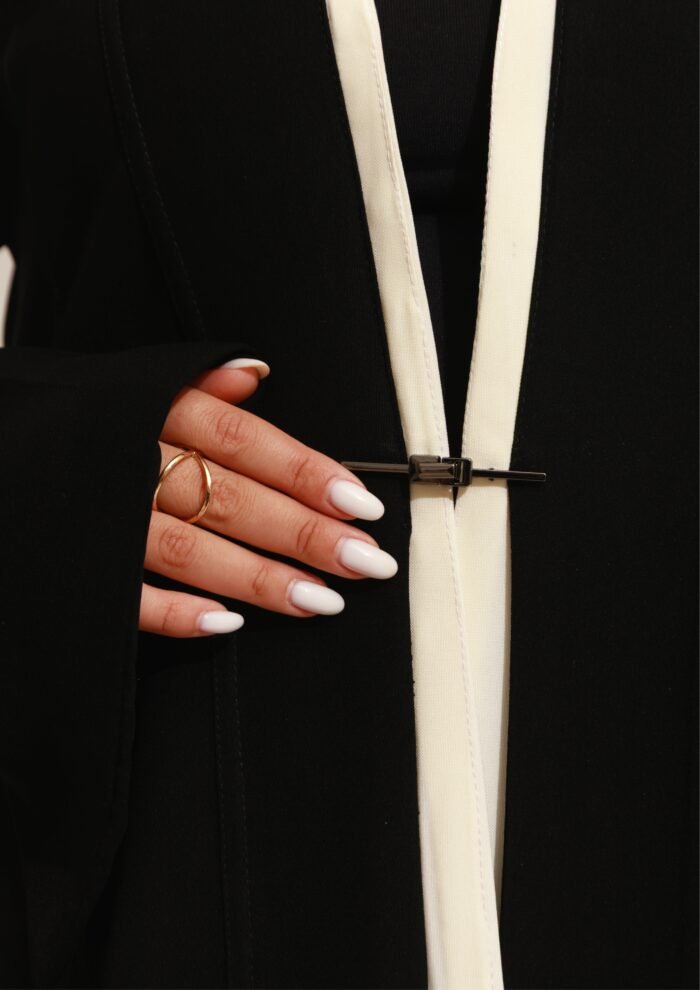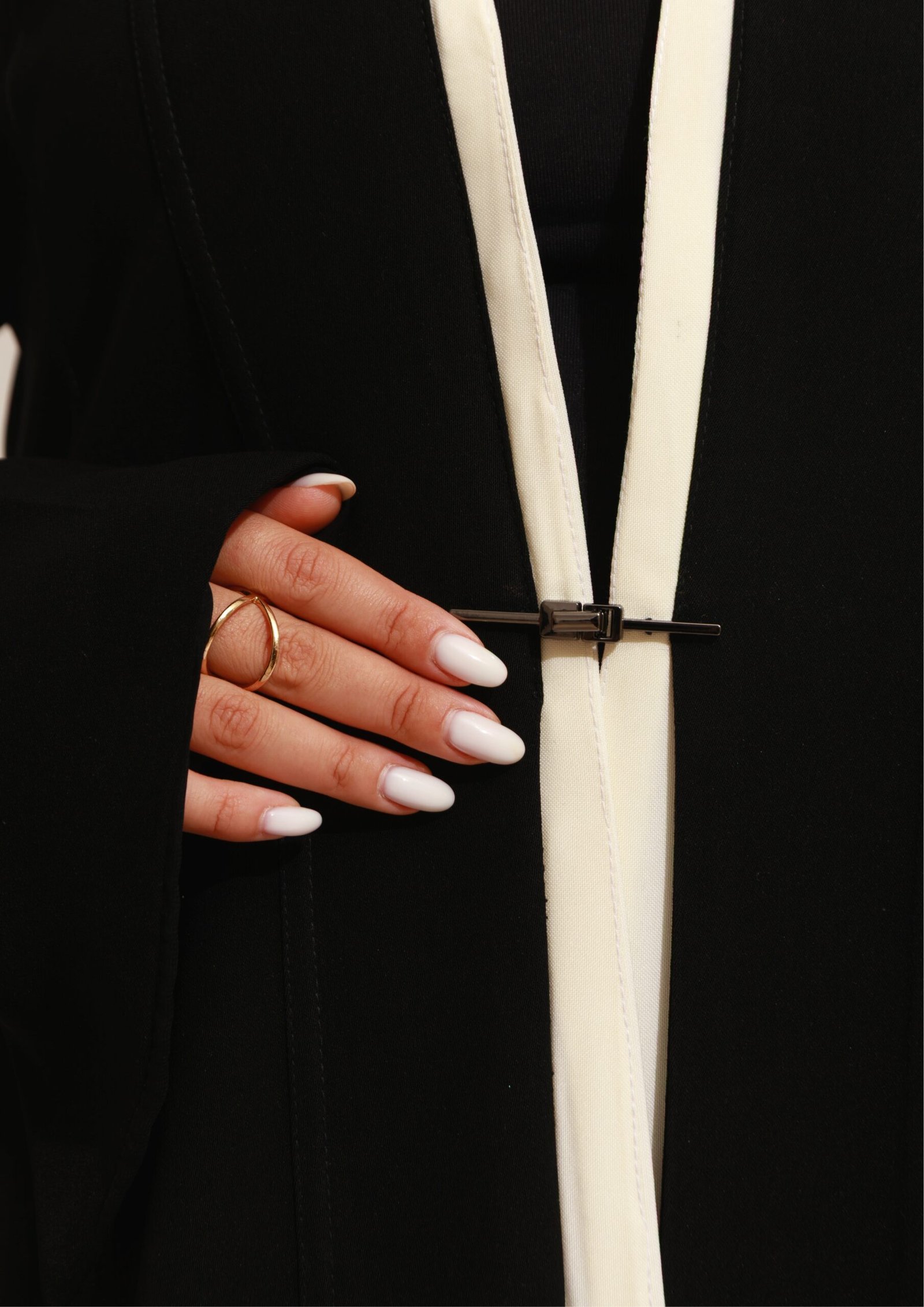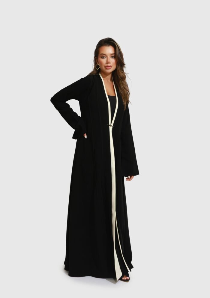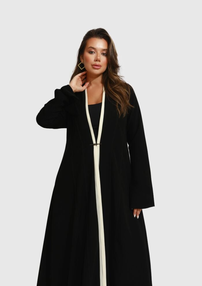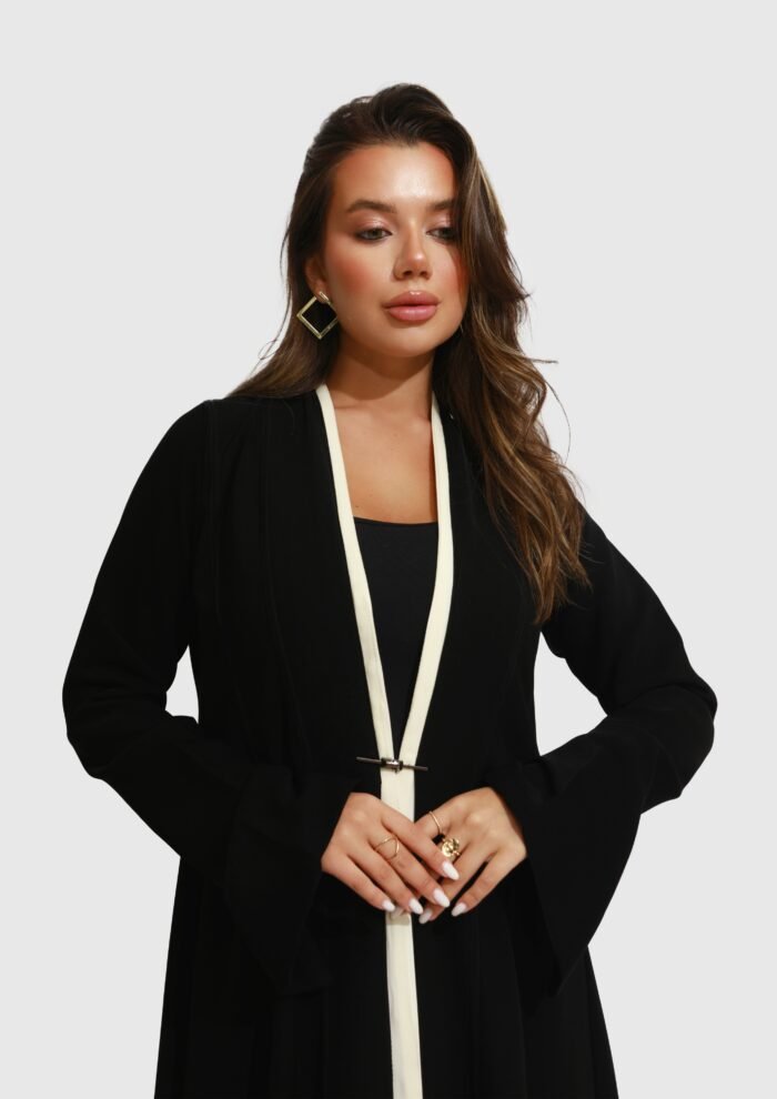 Black abaya with a flared cut, featuring a cream front panel and a metallic clasp closure for a sleek two tone finish.
