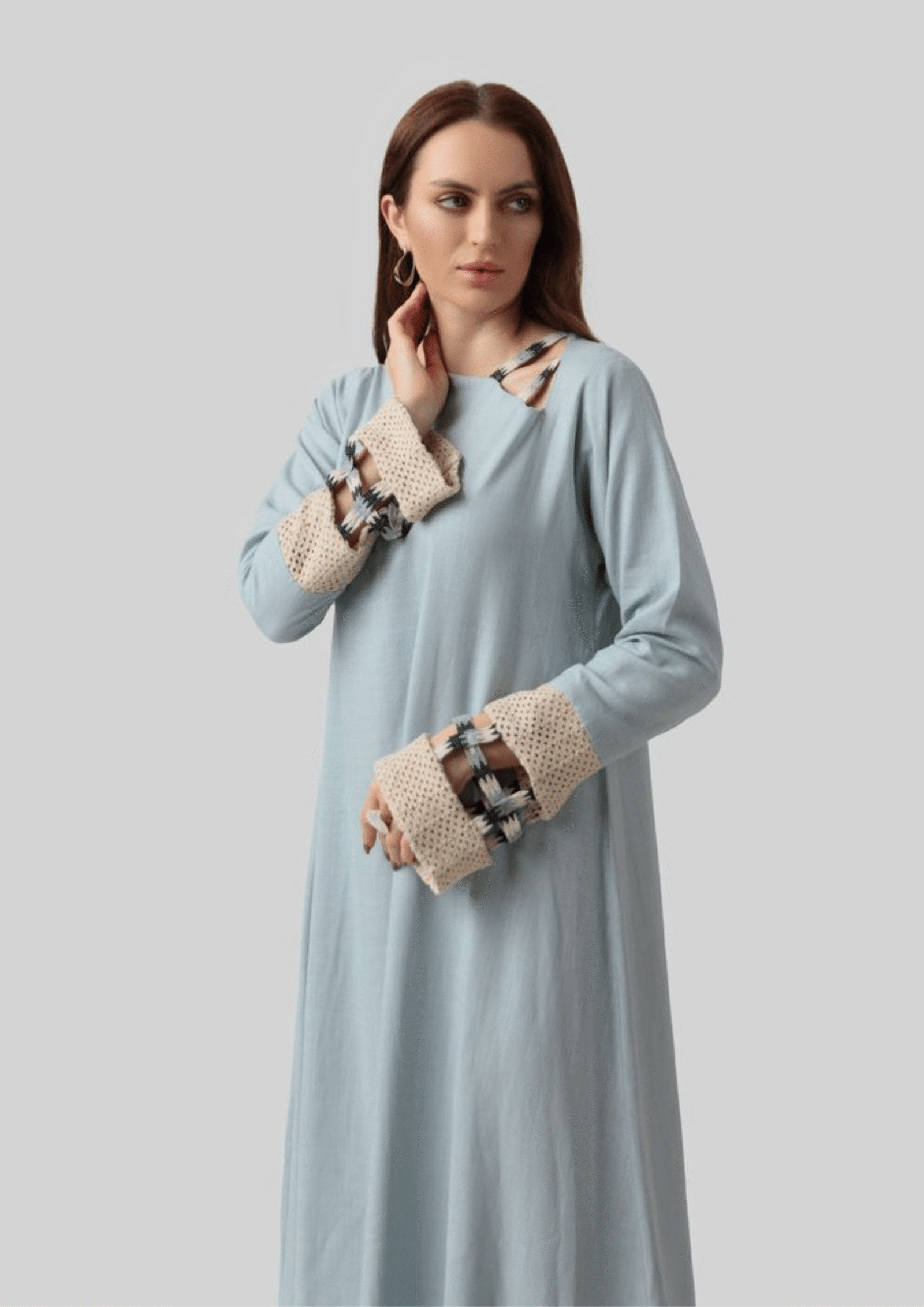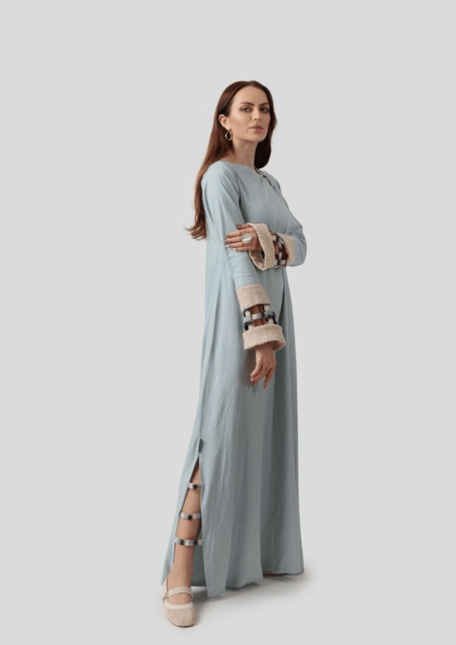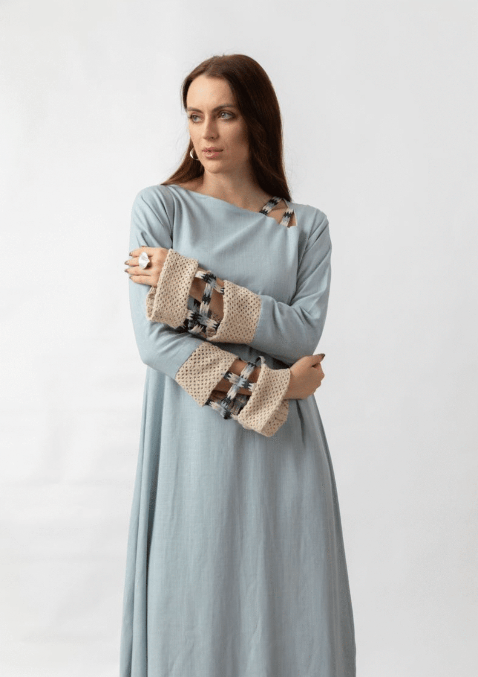 Textured linen in soft light blue. Designed with long sleeves, side slit, and woven cuff details with contrast accents. Clean and minimal overall.