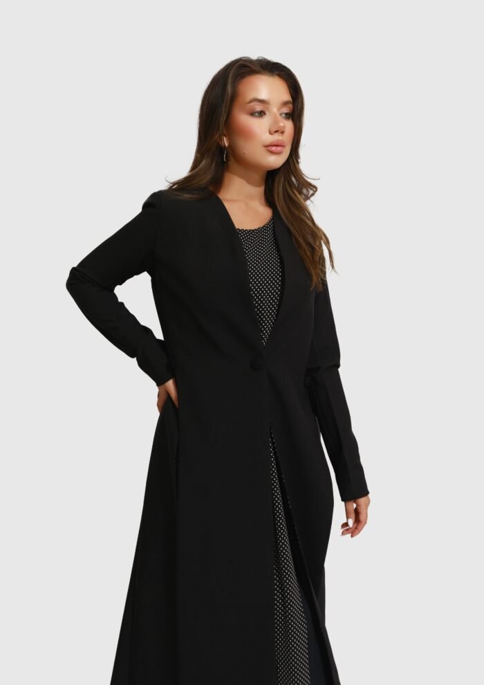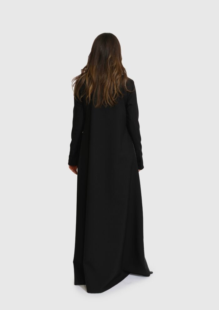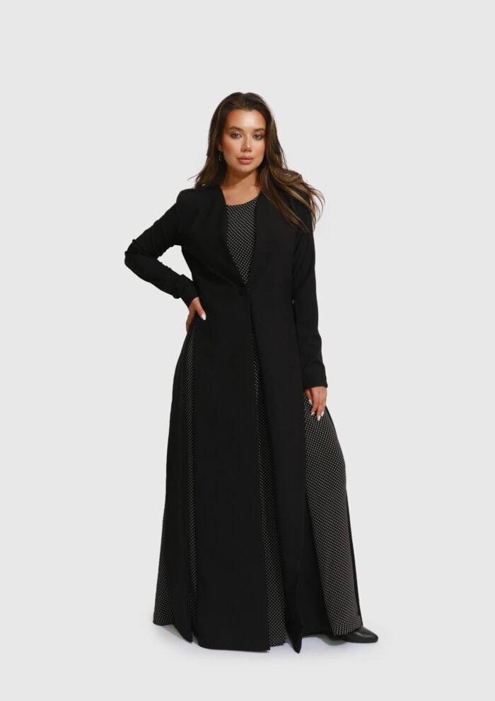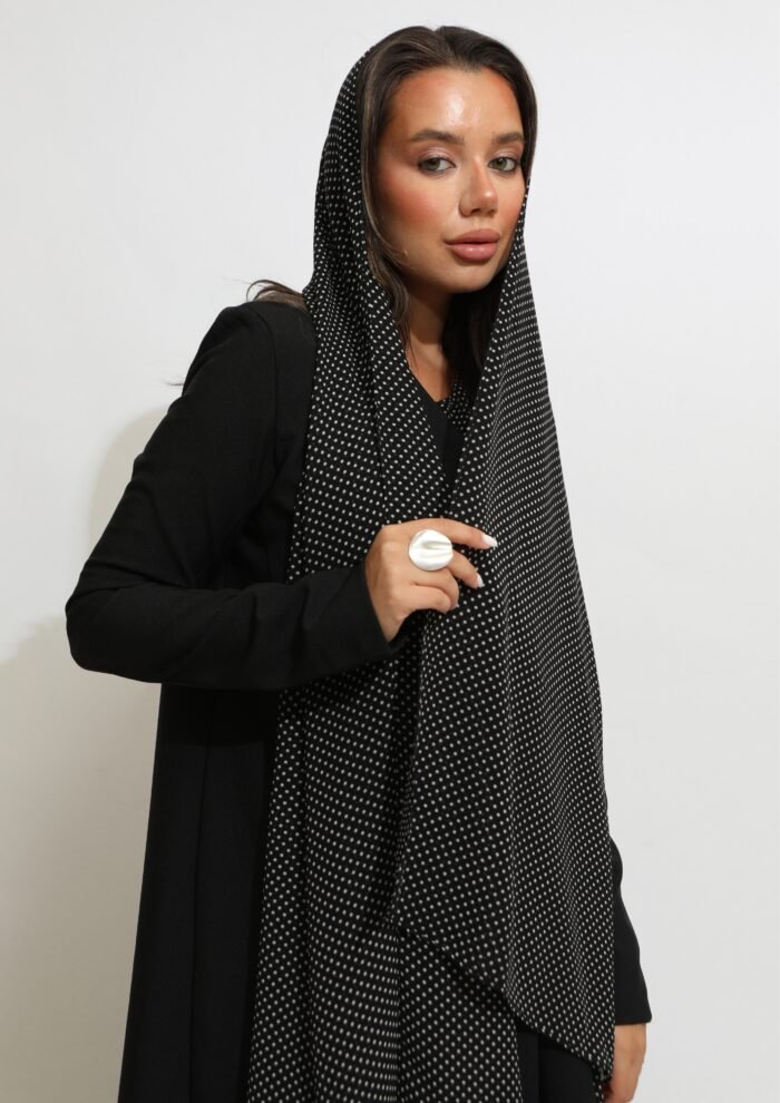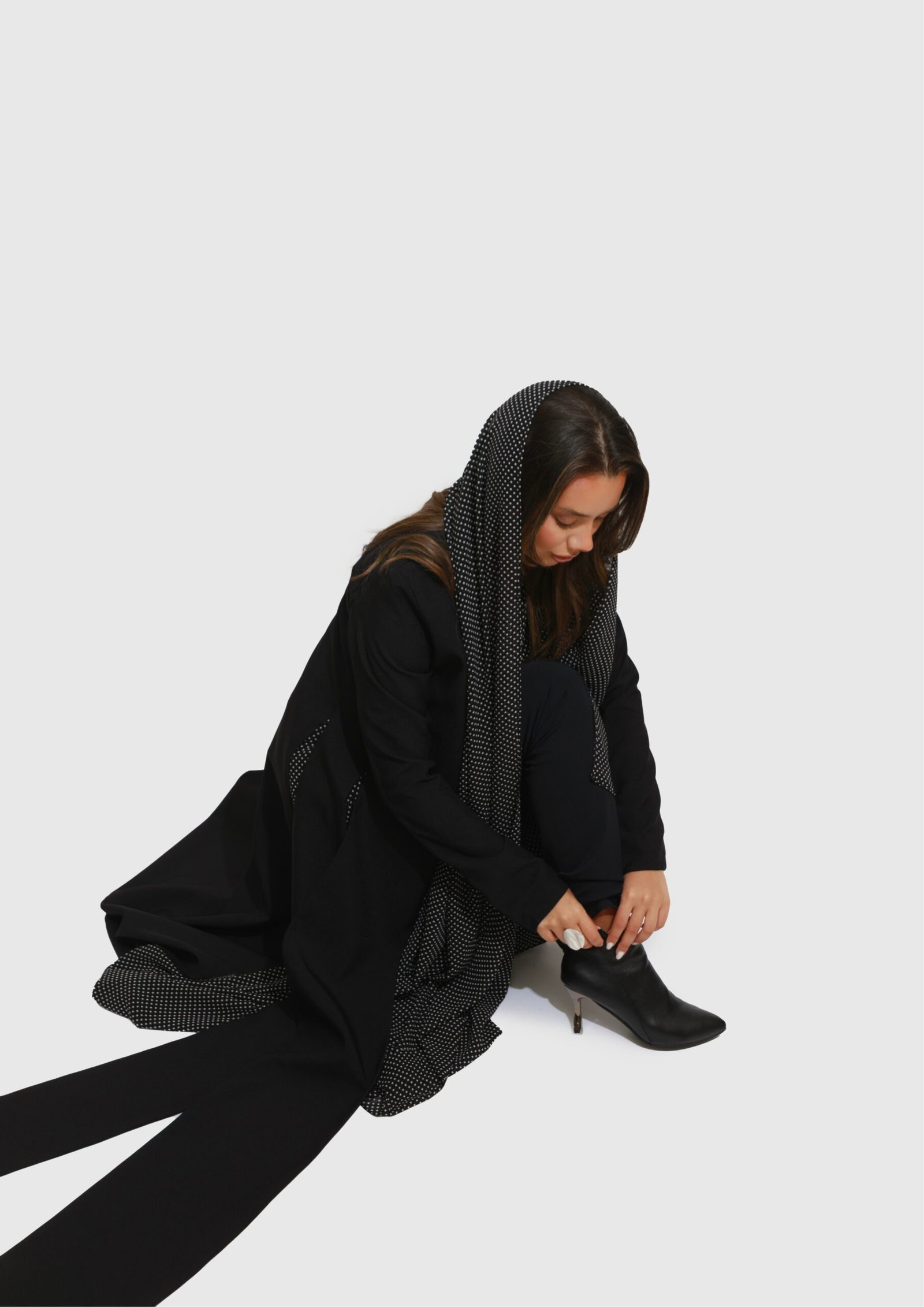 Black abaya with a slim flared cut, front buttons, and side inserts revealing a black and white polka dot chiffon, paired with a matching head scarf.