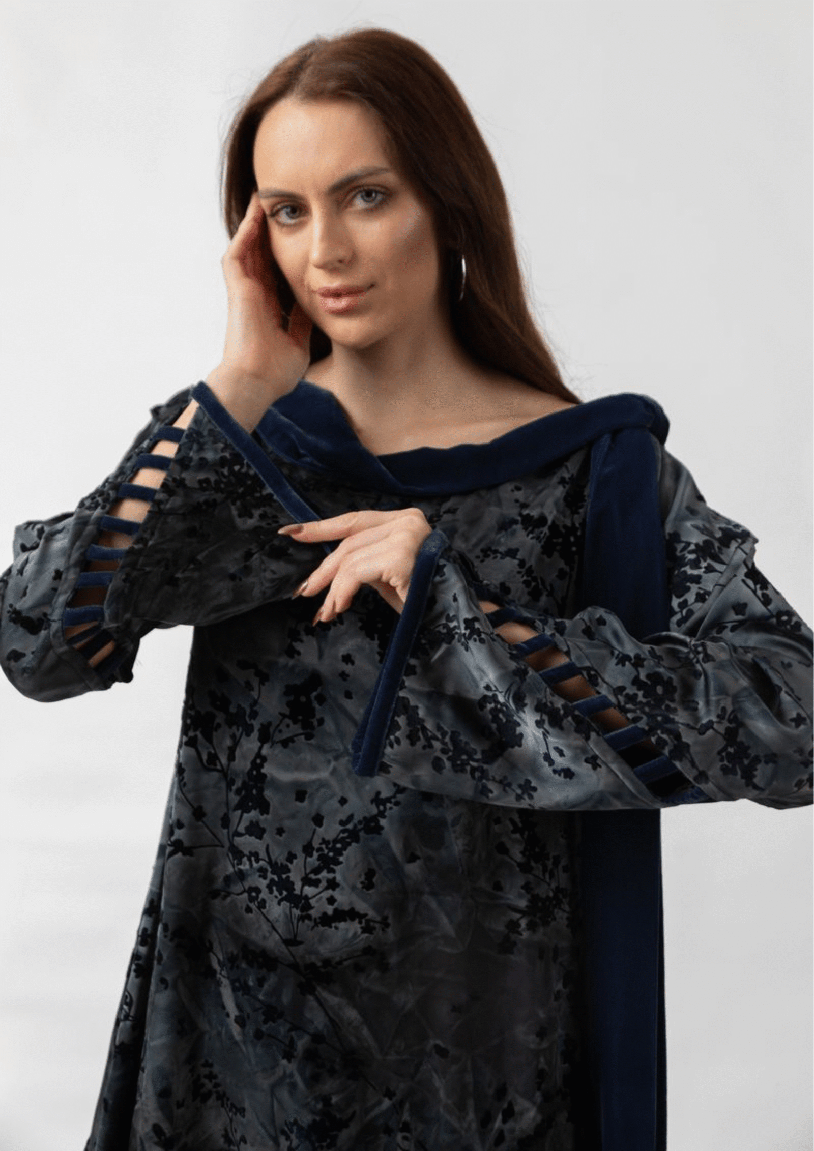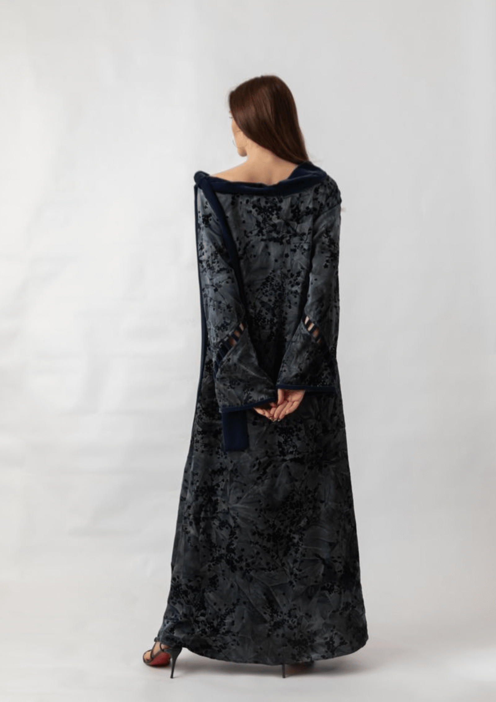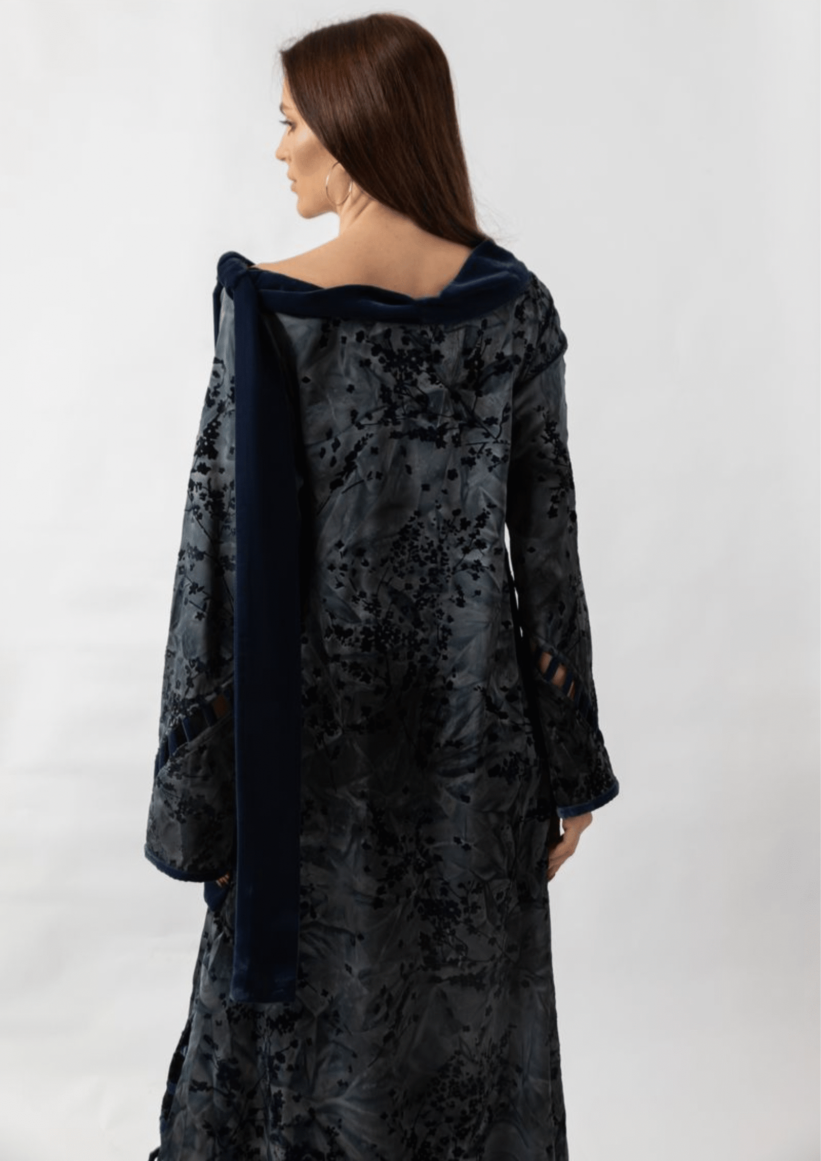 Silk with velvet floral pattern. Designed in dark blue tones, featuring velvet tie details at the shoulder, velvet accents on the sleeves, and side slit.