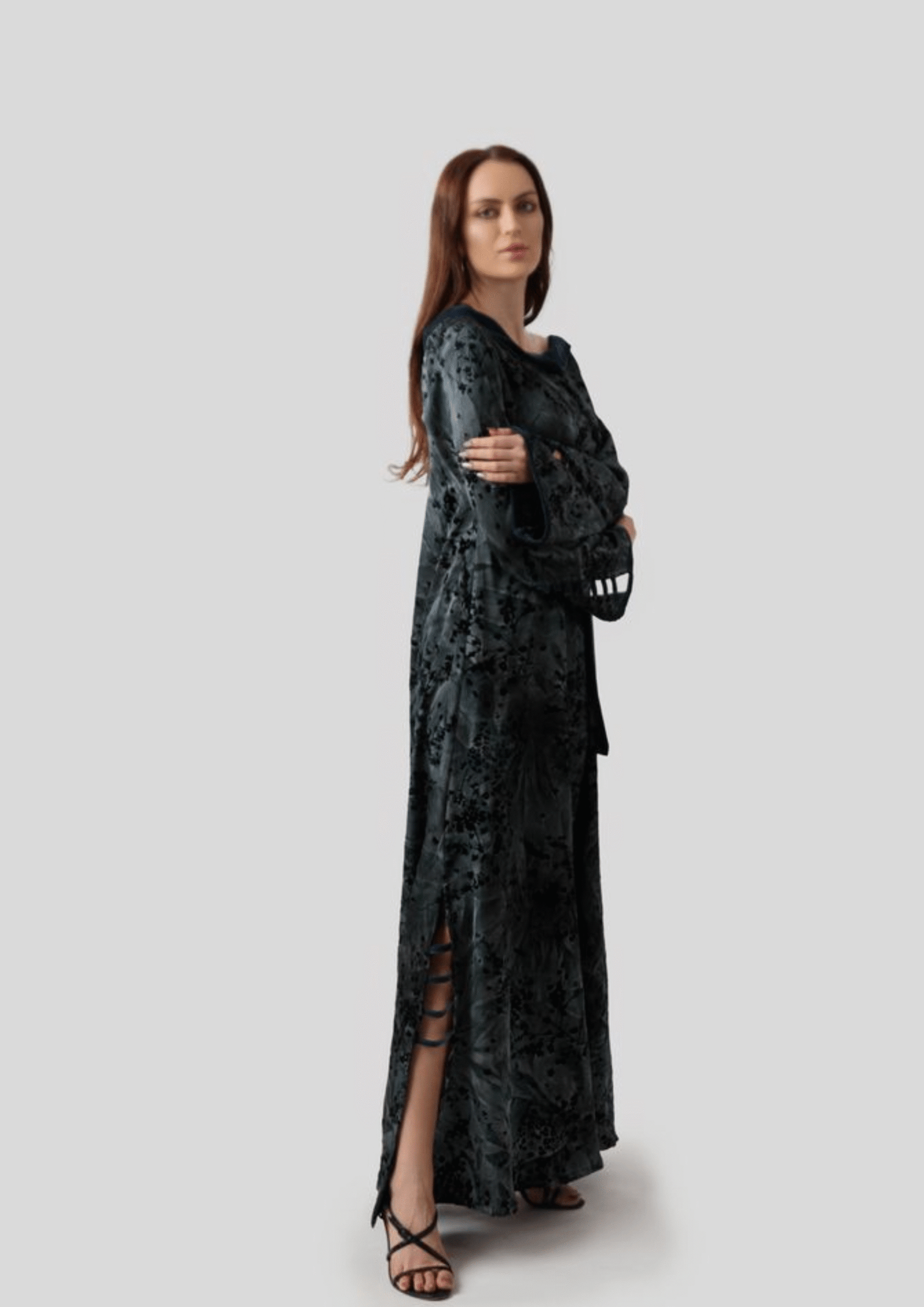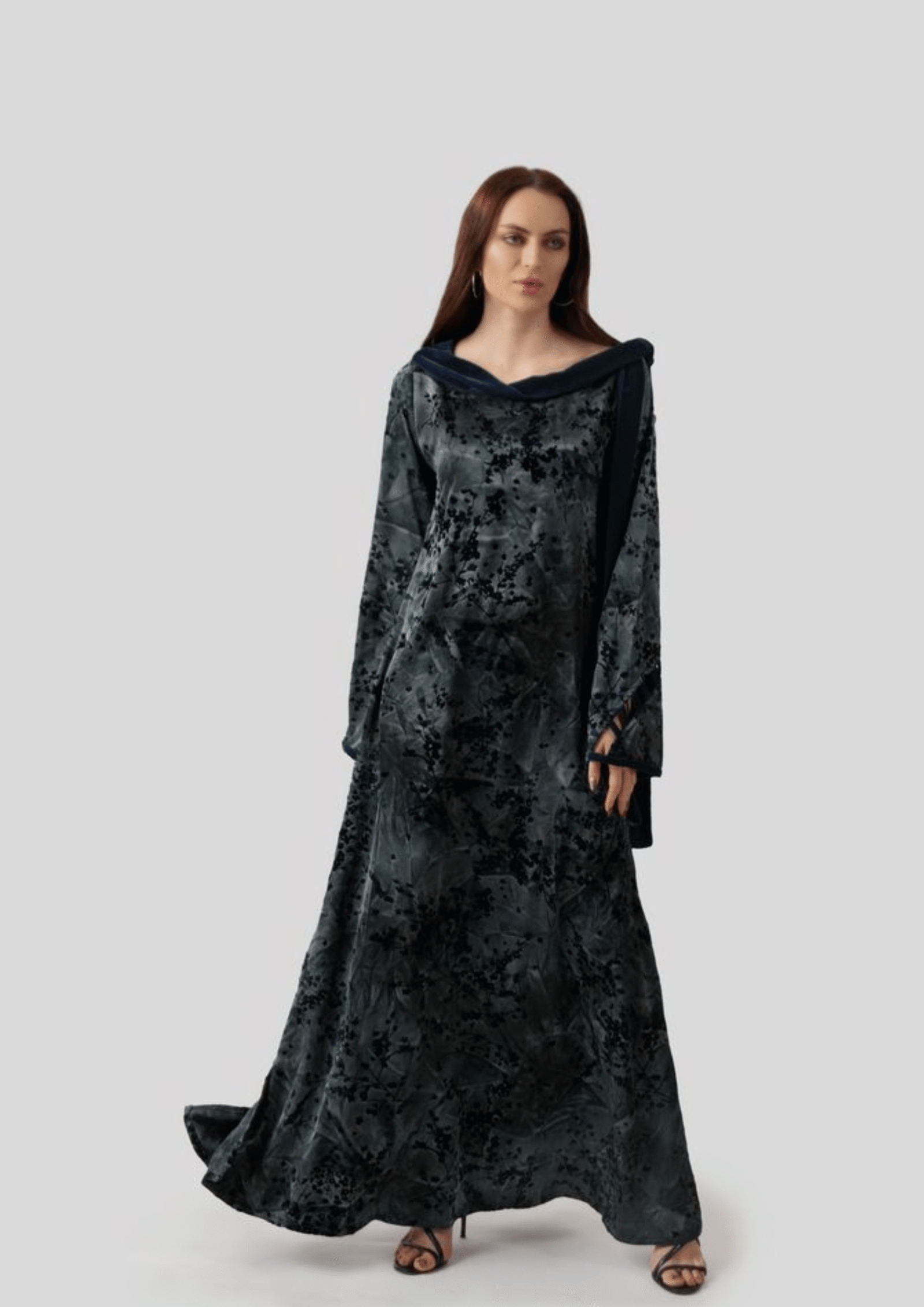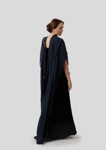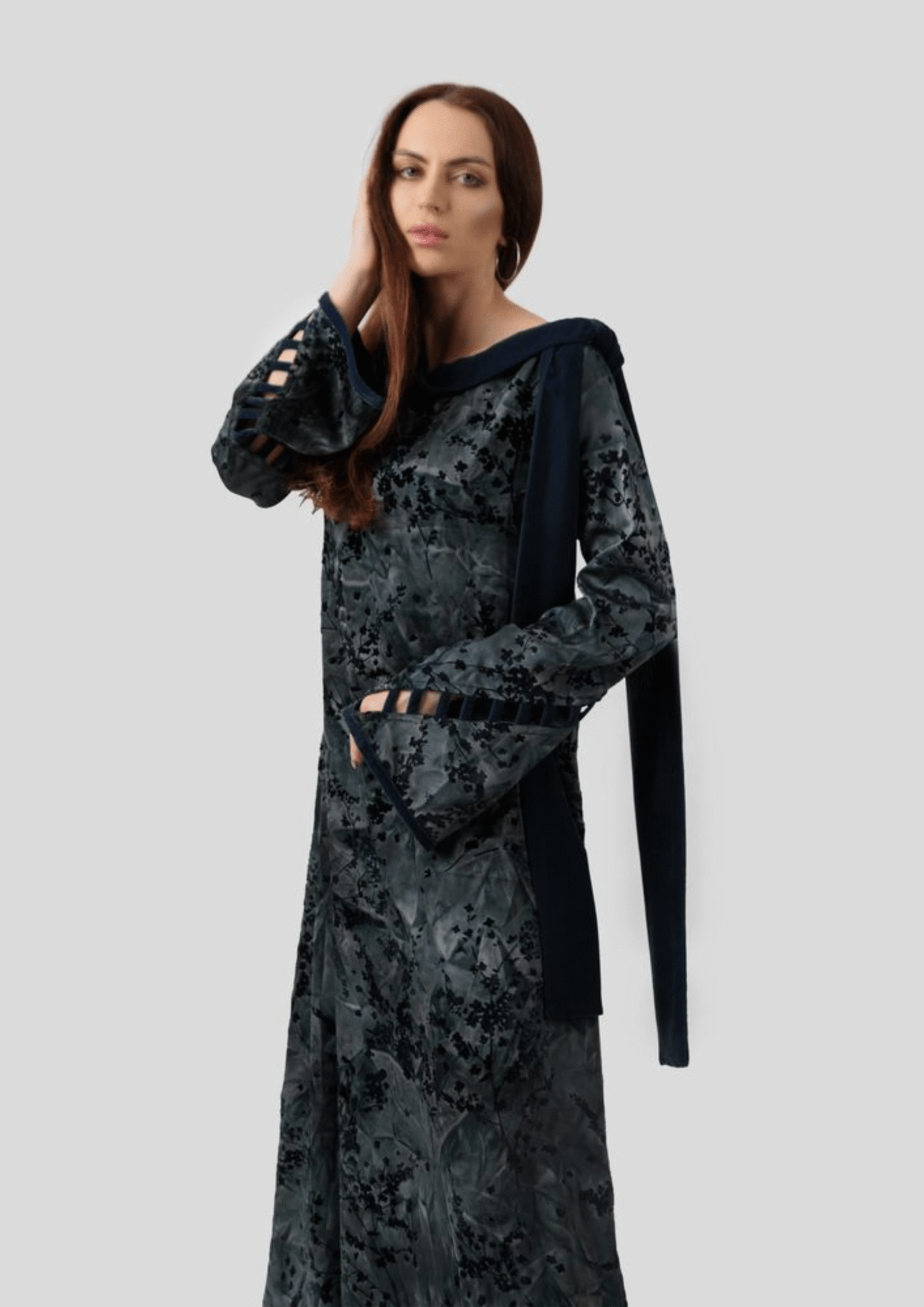 Silk with velvet floral pattern. Designed in dark blue tones, featuring velvet tie details at the shoulder, velvet accents on the sleeves, and side slit.