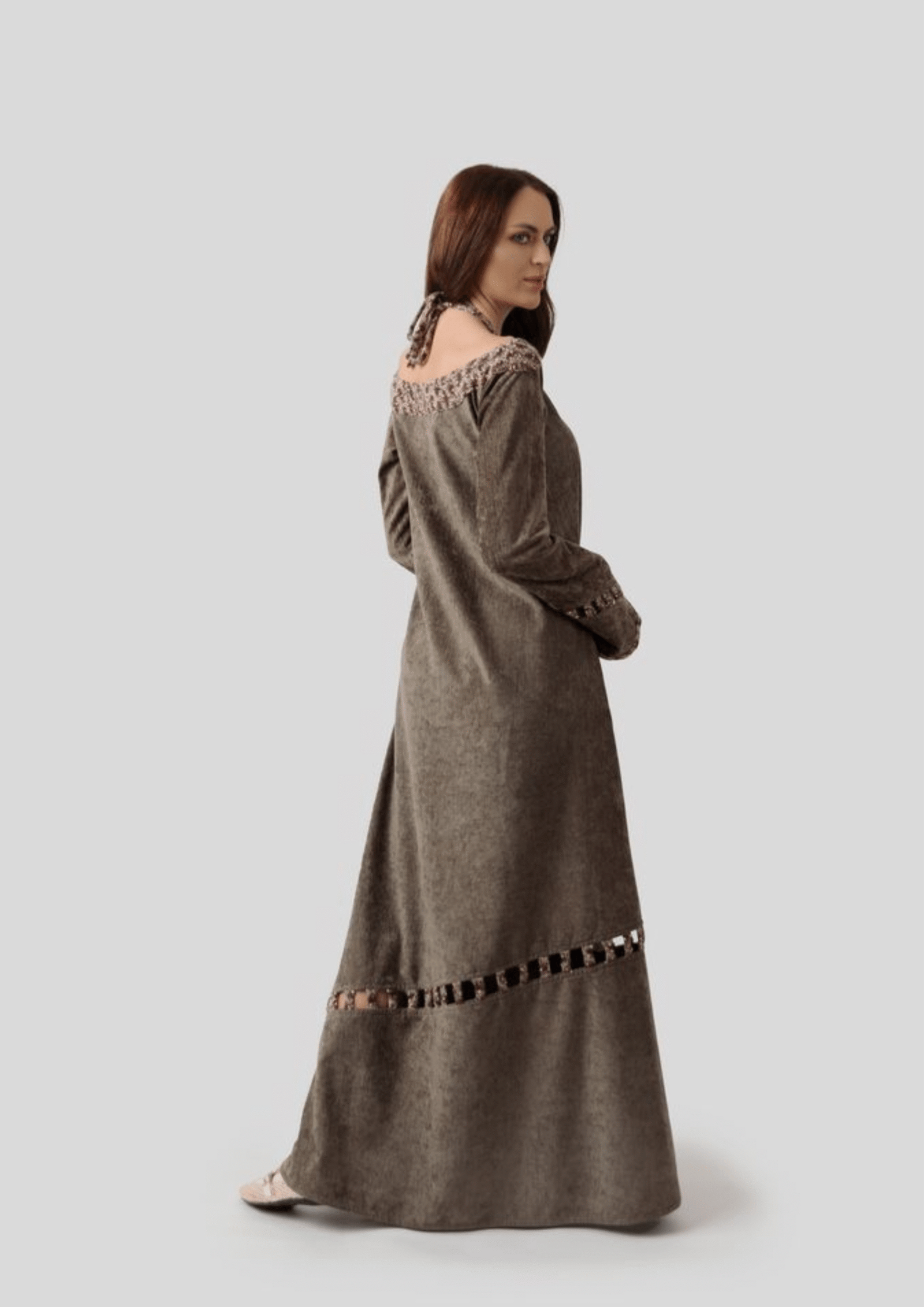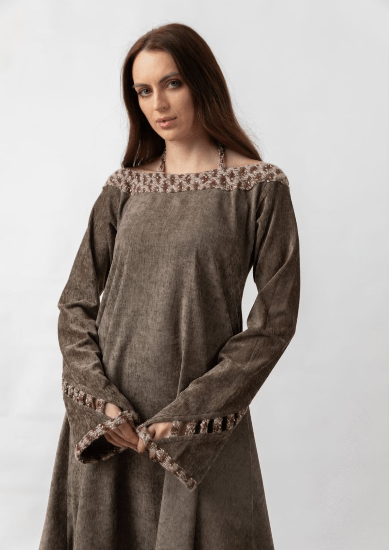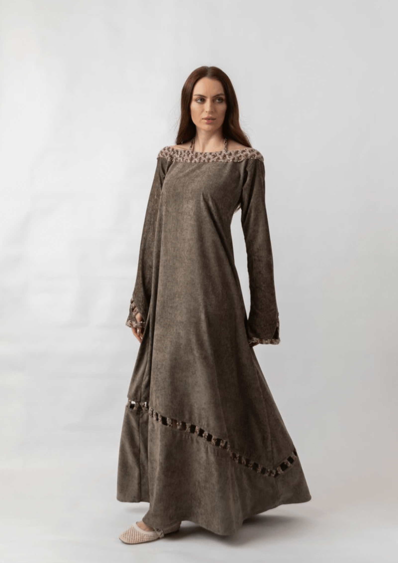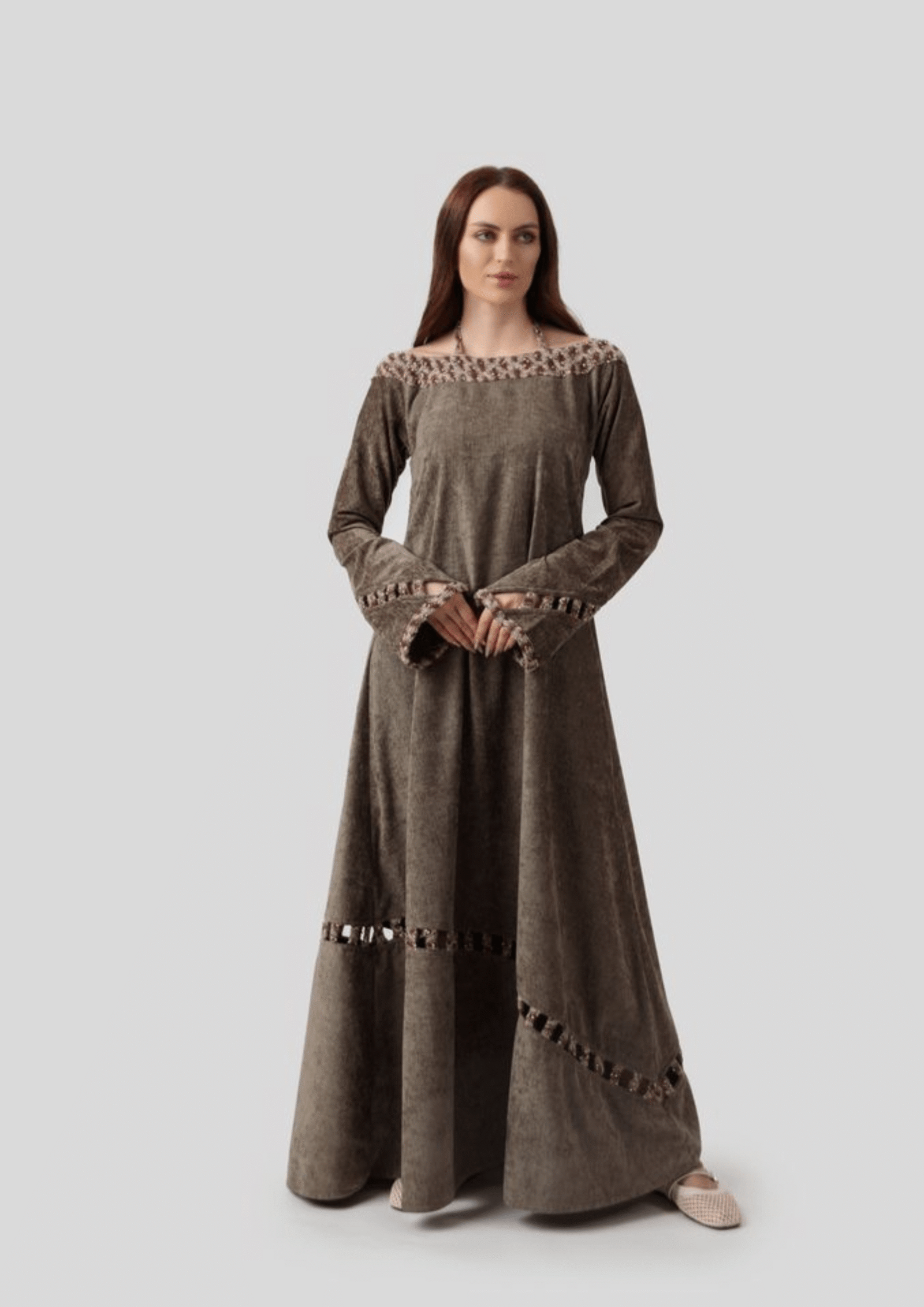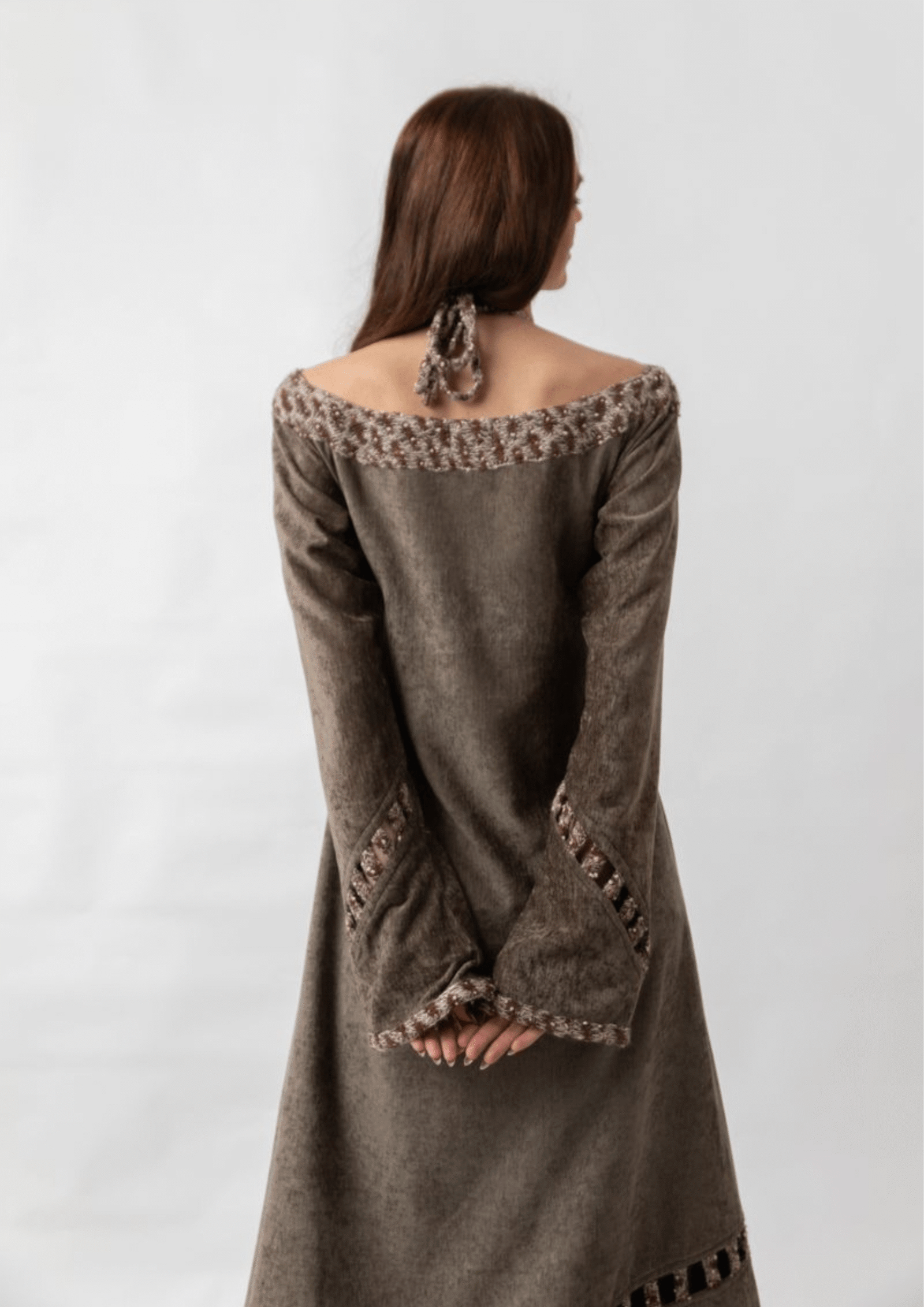 A textured velvet in olive brown tones. Designed with long sleeves, and woven trim at the neckline, cuffs, and hem.